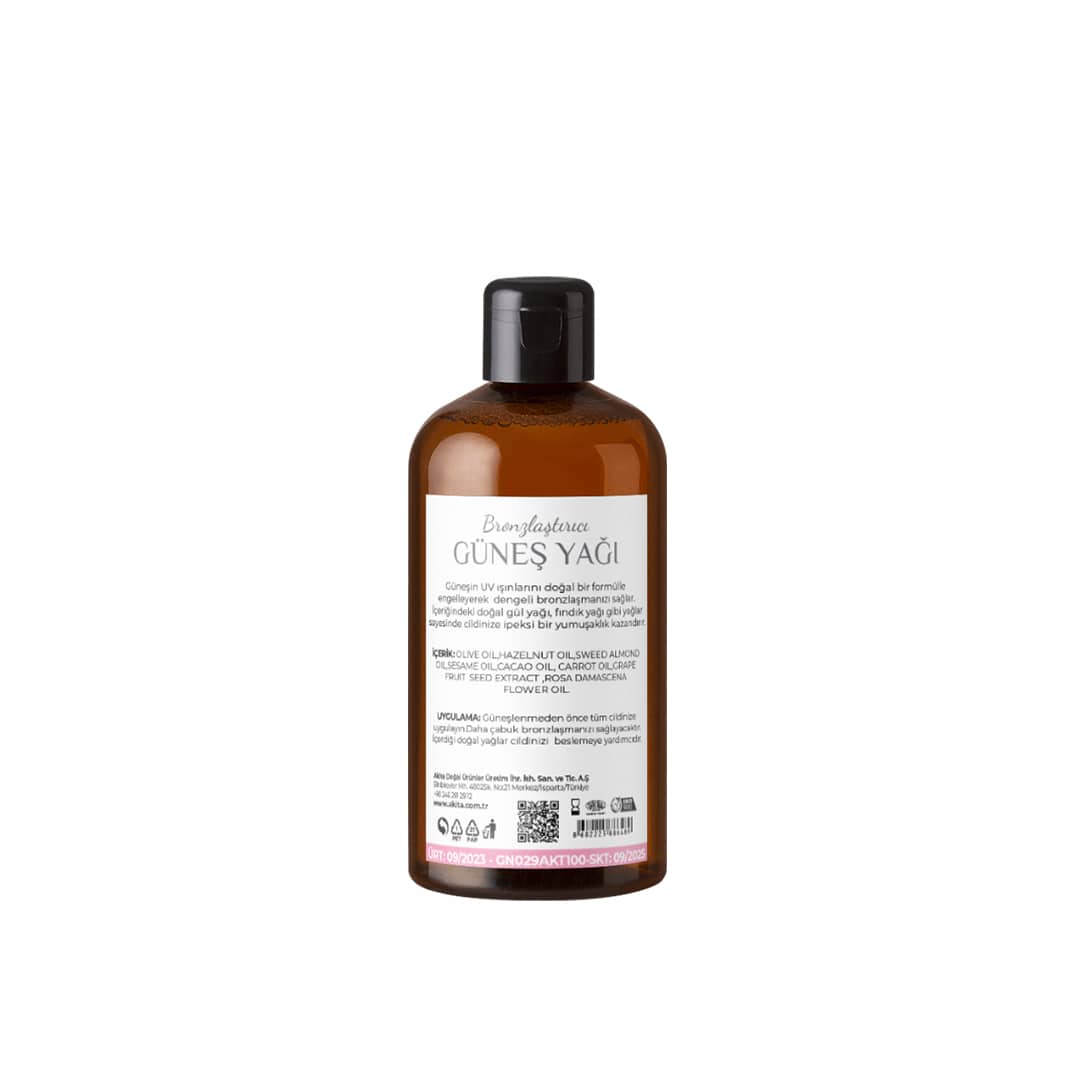Güneşin zararlı ışınlarını doğal bir formülle engelleyerek dengeli bronzlaşmanızı sağlamaya yardımcı olan saf güneş yağımız, cildinizi korurken içeriğindeki %100 doğal gül yağı, fındık yağı gibi yağlar sayesinde cildinize ipeksi bir yumuşaklık kazandırır. Cilde nem sağlama, besleme, antioksidan koruma ve esneklik kazandırma gibi çeşitli cilt bakım faydaları sağlayabilir. Doğal bronzlaştırıcı güneş yağı, doğal içerikleriyle cildinizi korurken aynı zamanda istediğiniz bronzluğa kavuşmanıza yardımcı olur.